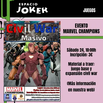 Evento "Marvel Champions" de 24 jugadores. Material a traer: juego base y expansión "Civil War". 3 Héroes distintos, cada uno con 1 aspecto distinto.