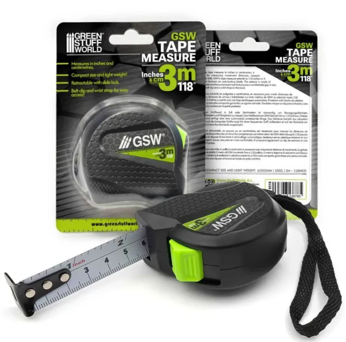 Con una longitud total de 3 metros (118 pulgadas), ofrece margen de sobra para medir movimientos largos, disparos de gran alcance, cargas extendidas y efectos que atraviesan buena parte del campo de batalla. En mesas estándar y escenarios amplios, este alcance evita tener que recolocar la cinta varias veces para una sola medición, lo que ayuda a que el juego avance con más ritmo y con menos cortes innecesarios, especialmente cuando se miden distancias constantemente turno tras turno.