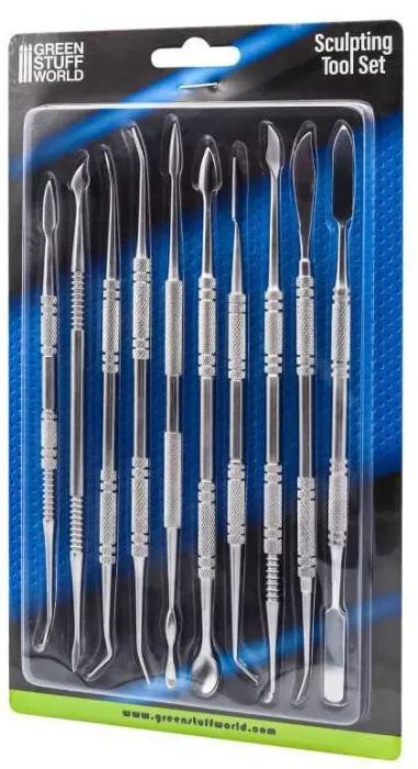 Set de 10 herramientas para esculpir y modelar. Tienen un total de 20 puntas diferentes de acero inoxidable para usarlas en conjunto con Masillas de todo tipo como la Masilla Verde, Milliput, Sculpey, Arcillas, etc. Para todo tipo de modelaje artístico y retoque de figuras.