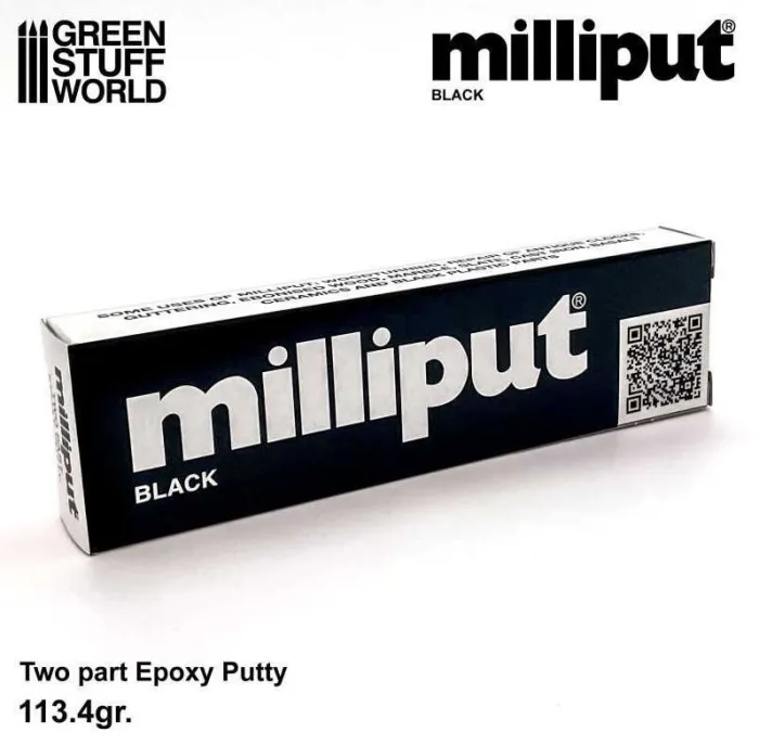 Milliput Black es una masilla epoxi de dos componentes utilizada para modelar y esculpir. Es una versión teñida de la milliput standard, por lo que es ideal para crear sombras así como dar profundidad en esculturas y dioramas. Milliput Negro es versátil y se puede utilizar para una variedad de aplicaciones de modelado y modelismo, incluyendo la adición de detalles a las figuras en miniatura, la reparación y el relleno de huecos, así como la creación de superficies con textura. Al igual que otros tipos de Milliput, es fácil de trabajar, se seca con un acabado duro y duradero, y se puede lijar, taladrar y pintar una vez que ha fraguado.