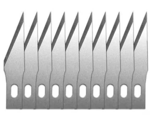 Incluye 10 cuchillas tamaño #11 (2,5 cm largo) perfecta para piezas de plástico o metal. Muy afiladas.