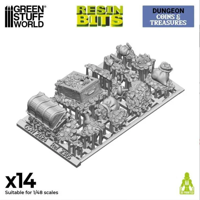 Un vasto tesoro de 14 piezas de diferentes tamaños. Desde pequeños montones de monedas hasta montones medianos y grandes que contienen copas, joyas, cofres y sacos de dinero para darle una riqueza extravagante a tus figuras y dioramas.