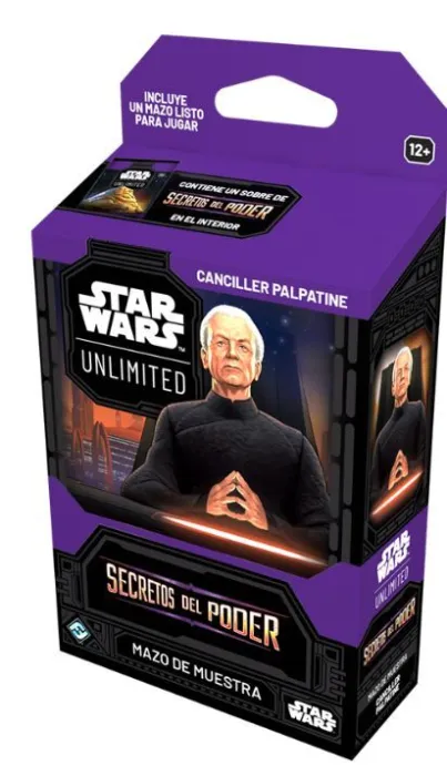 ¡Conspira en la sombra y planea tu victoria definitiva con el Canciller Palpatine en este Mazo de muestra! Dentro de esta caja encontrarás una carta de líder del Canciller Palpatine y un mazo de 50 cartas listo para empezar a jugar sacando el máximo partido de sus puntos fuertes. El mazo contiene cartas de múltiples colecciones, incluidos conjuntos enteros de 4 cartas de rareza especial, así como indicadores de daño, fichas y un sobre de ampliación de Secretos del poder con el que podrás aumentar tu colección.
